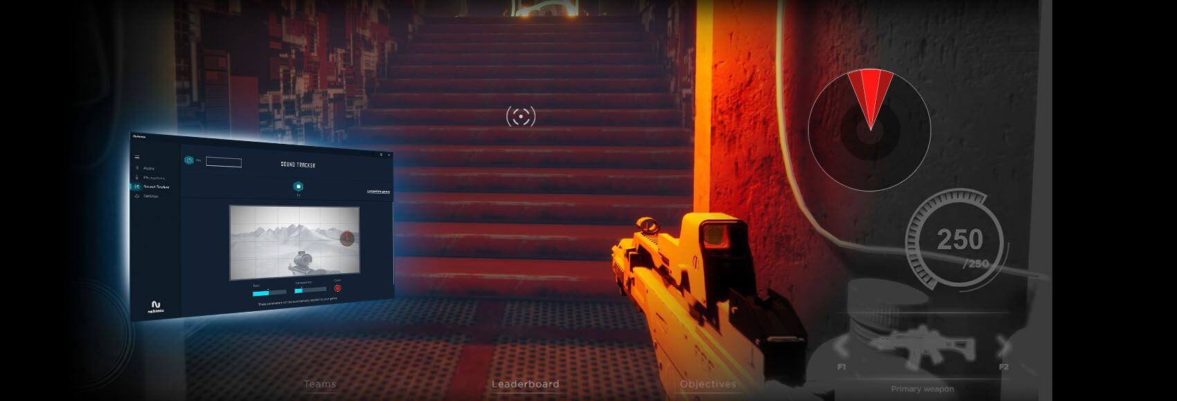 The Sound Tracker is a visual indicator that points out the directions from which predominant sounds are coming. Each sound is properly positioned in 360° on a radar for a full immersion during the game.
