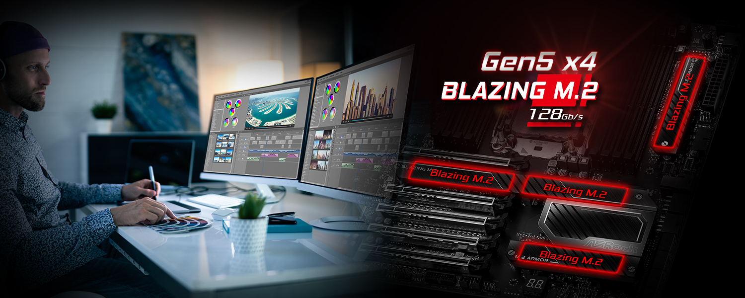 This workstation motherboard supports 4 PCIe Gen5 x16 slots, deliver all the performance of PCIe Gen5 to your GPU and add-on cards. Fulfill all the professional design, deep learning, simulation and rendering applications.