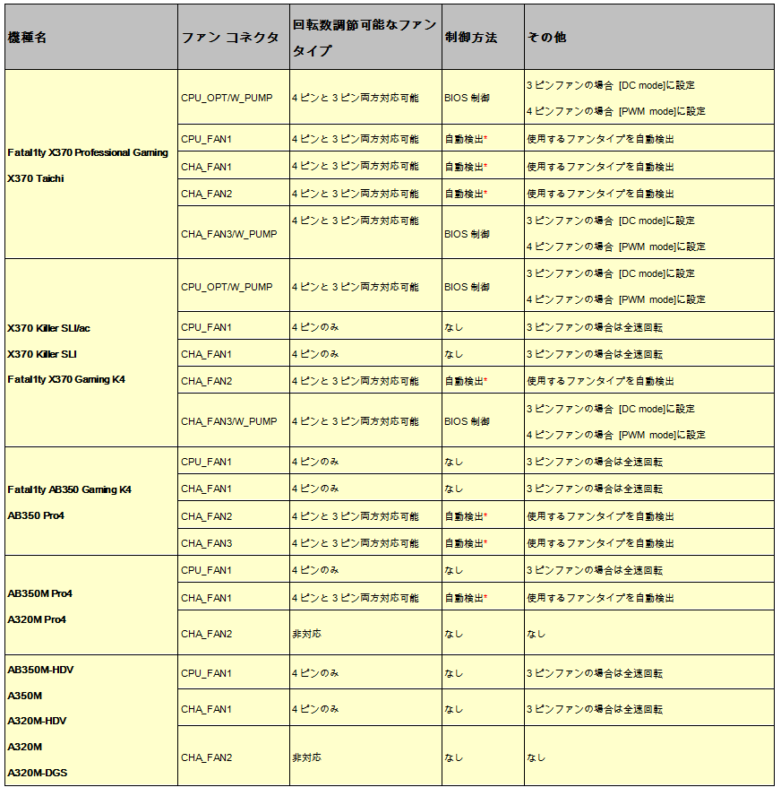 各機種のファン対応タイプとファンコネクタ仕様情報は下記の対応一覧表にて御参考下さい。